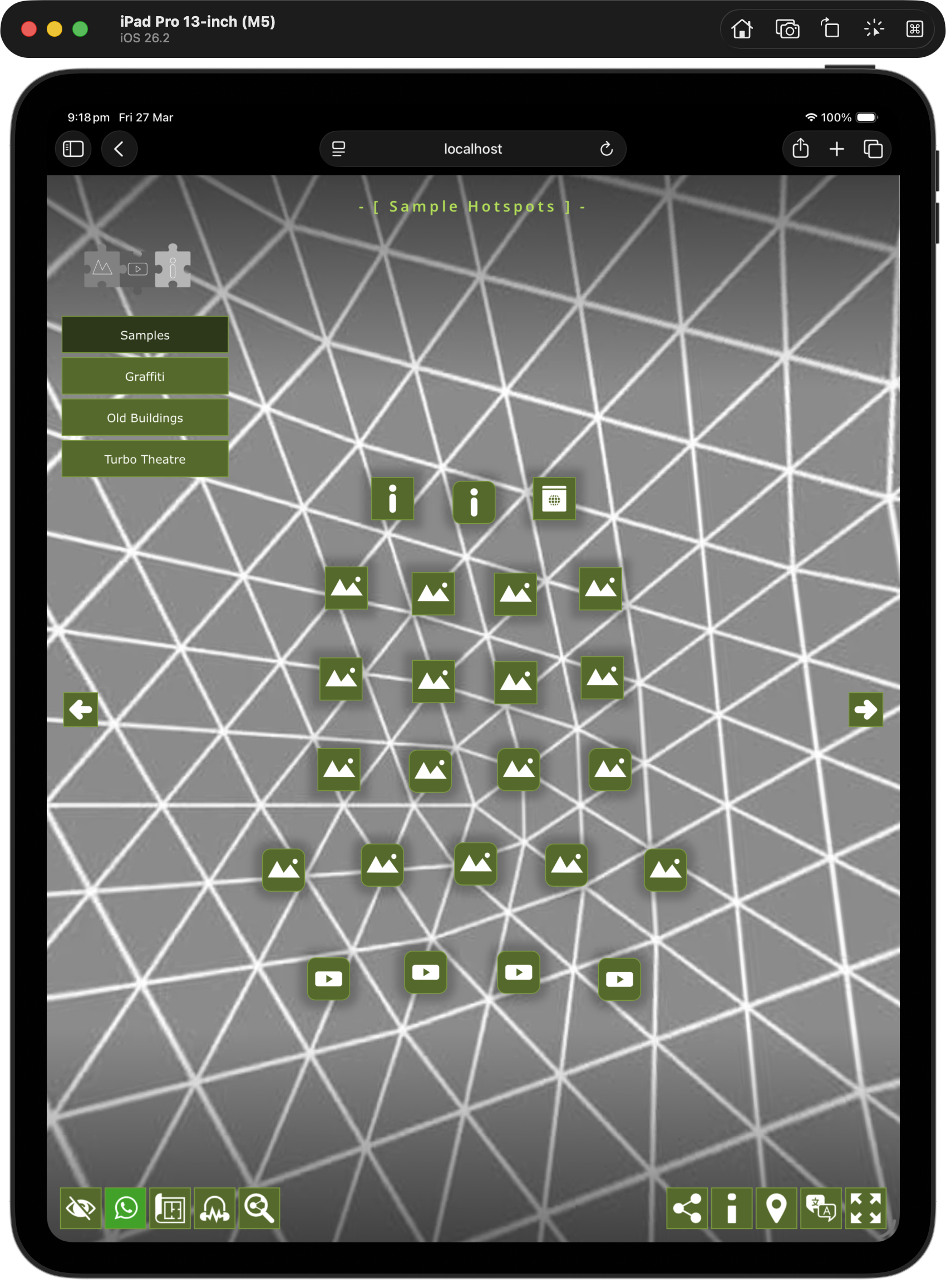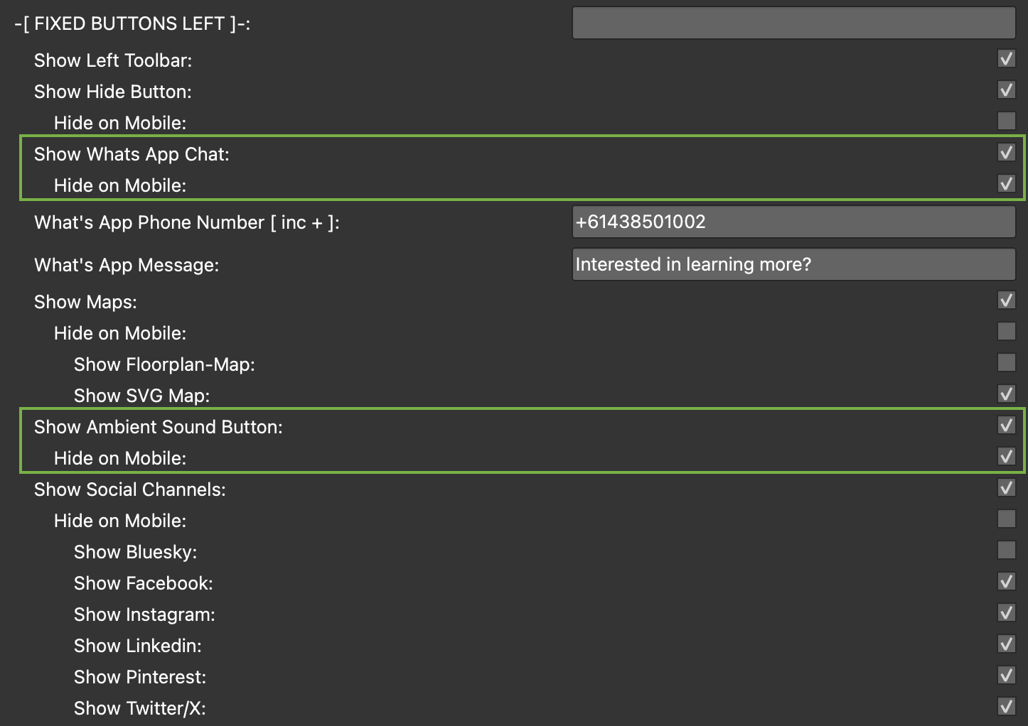 Left: Hide All | What’s App | Maps (Floorplans, Maps & SVG Map) | Ambient (on/off) | View Social Sites