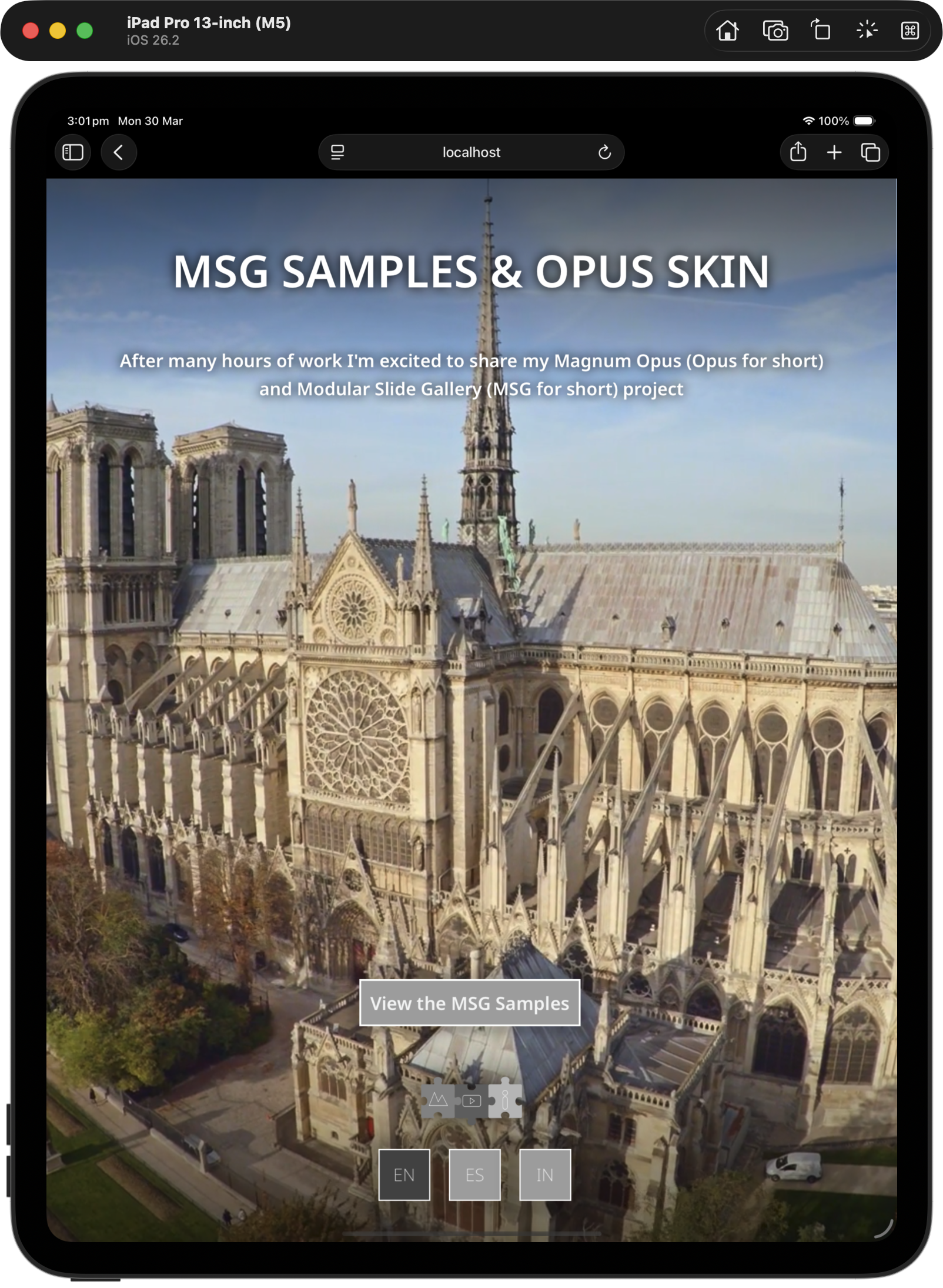 This version displays a fullscreen image as the background. Overlayed over the panorama are CSS top and bottom gradations, and on top of that is the title, description, enter button, logo and language buttons.
