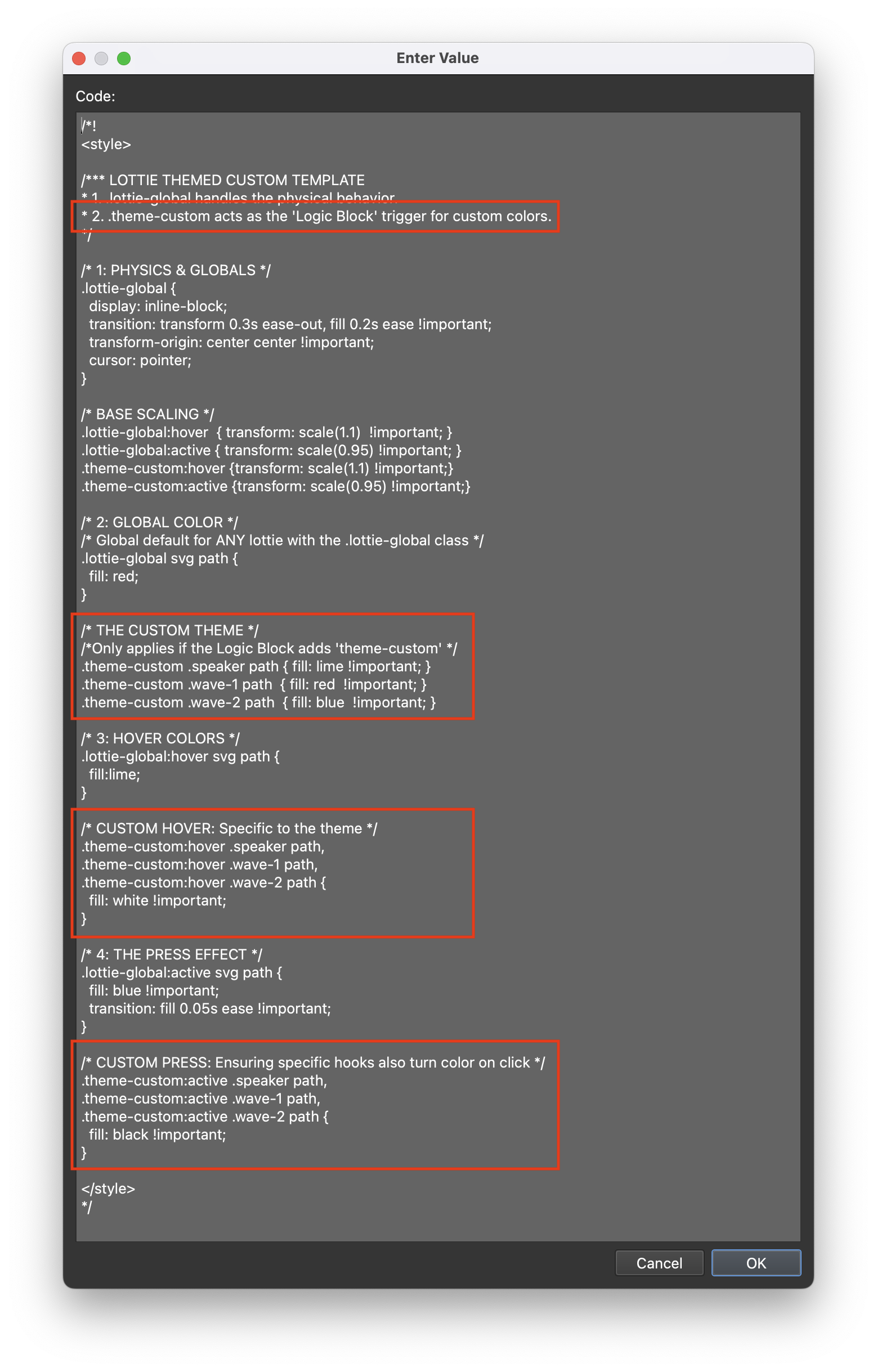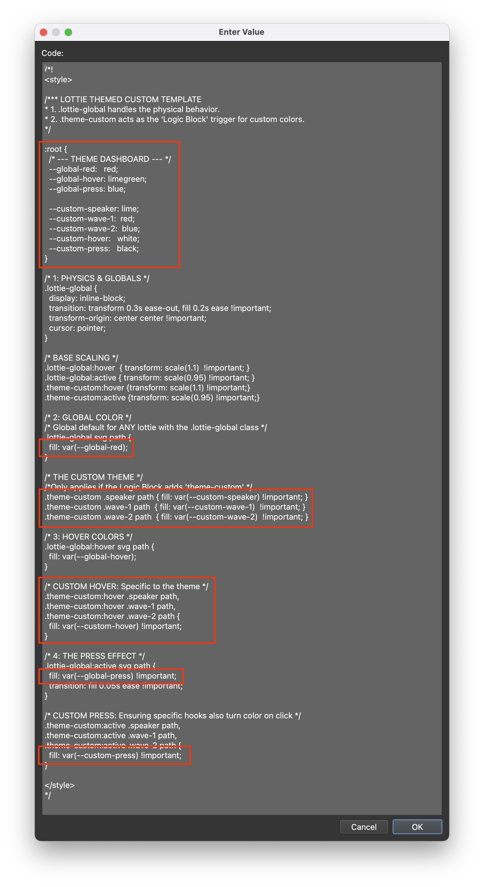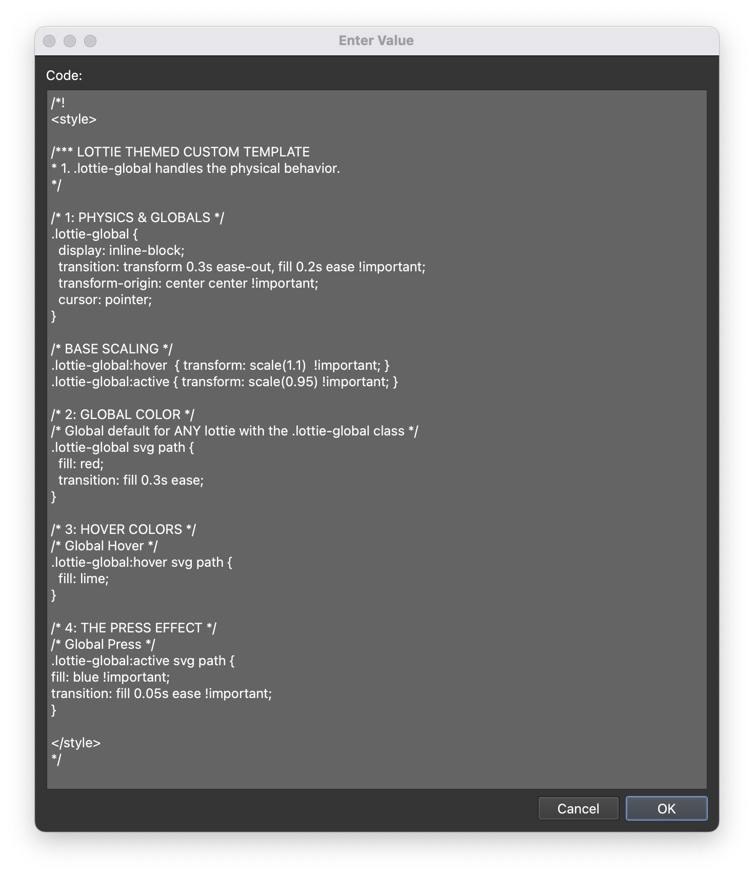 2. Open the Lottie-CSS Enter Value window and update the Global CSS code with the bolded Custom CSS code below. (figures #9 & #10)
