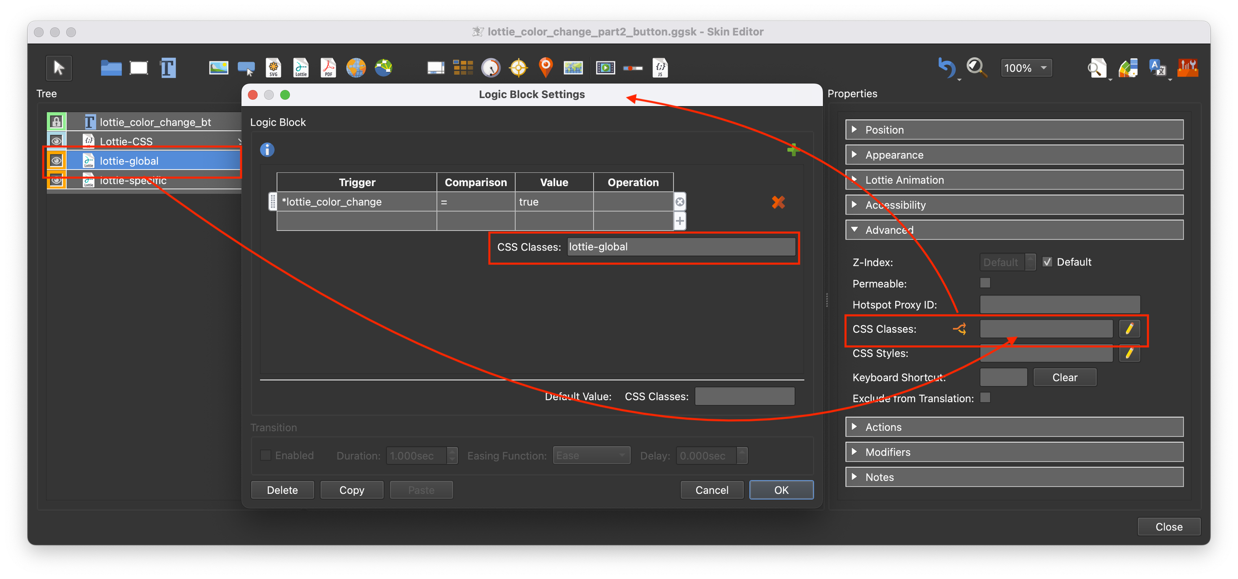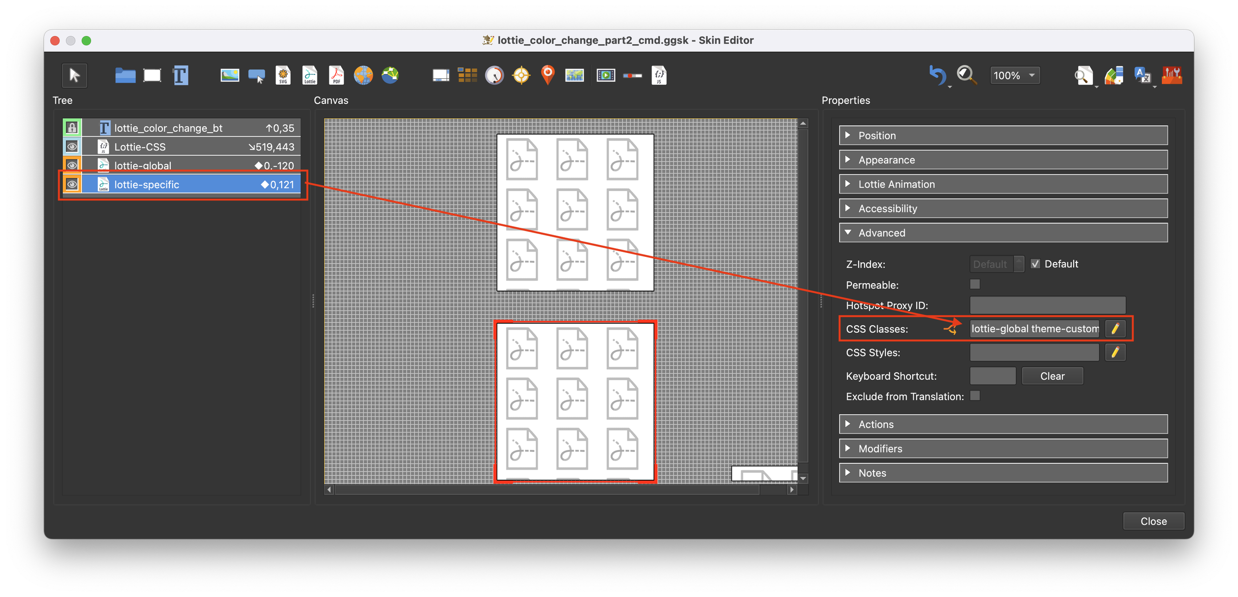 5. In the Properties > Advanced > CSS Classes enter lottie-global