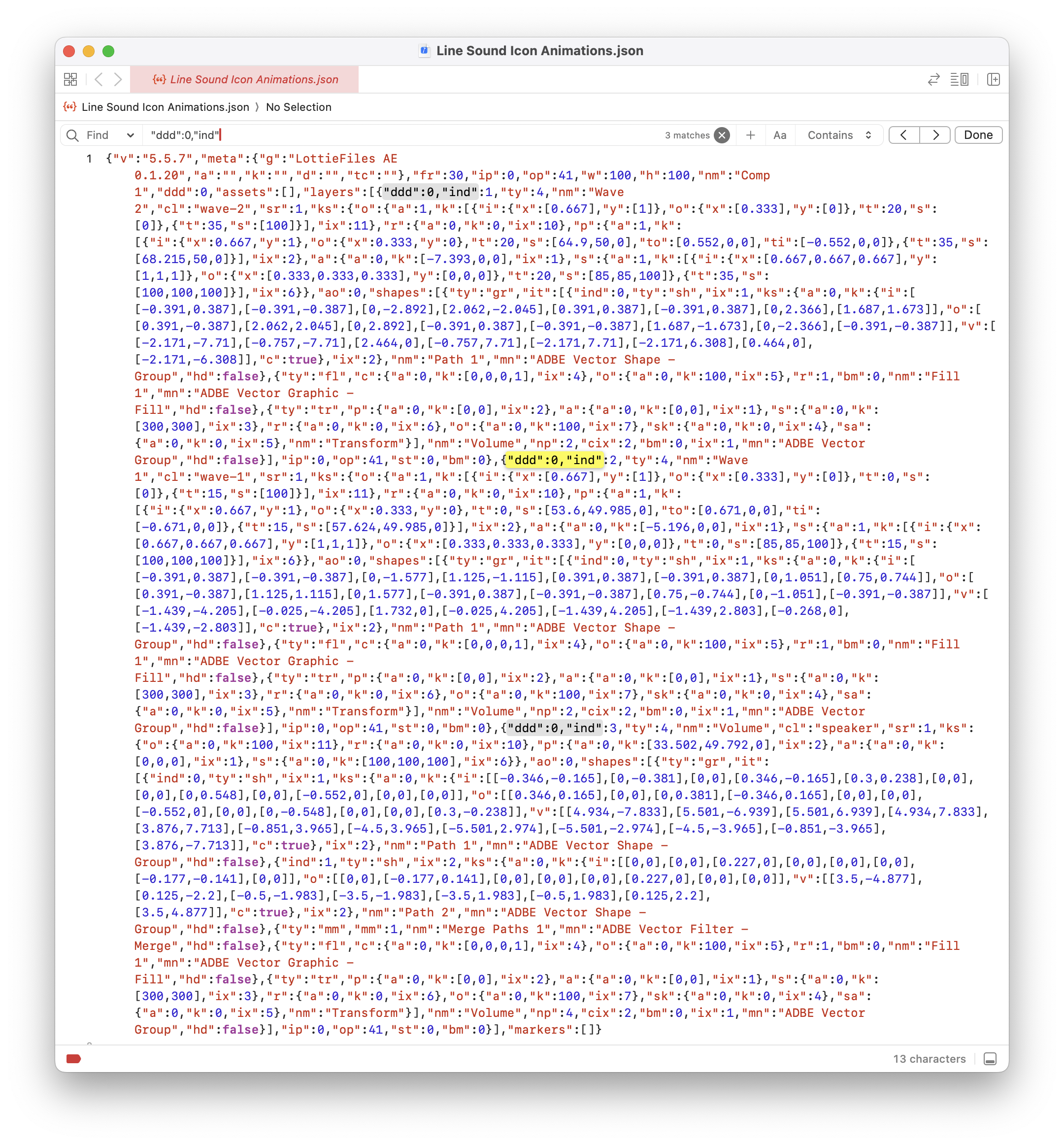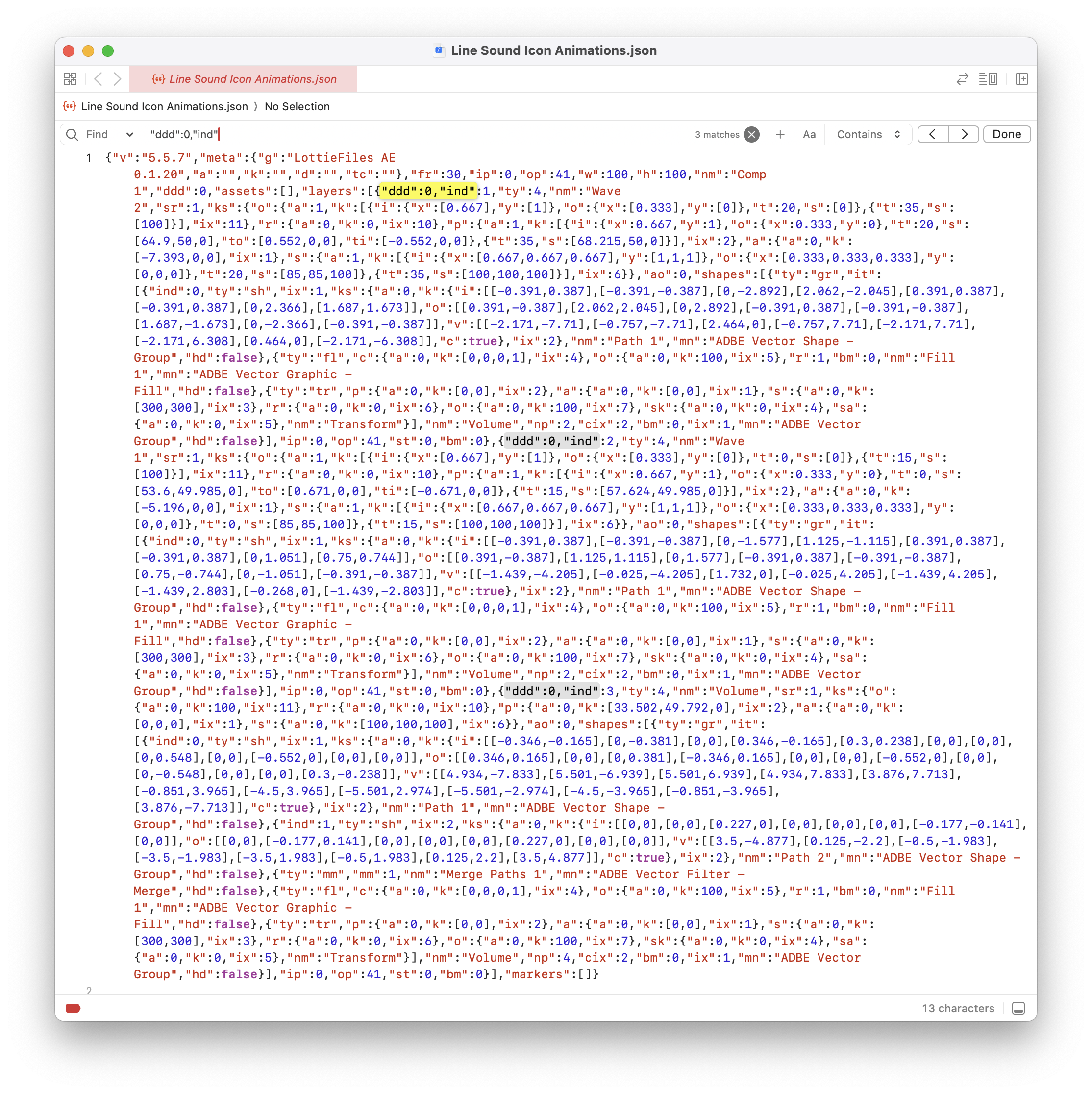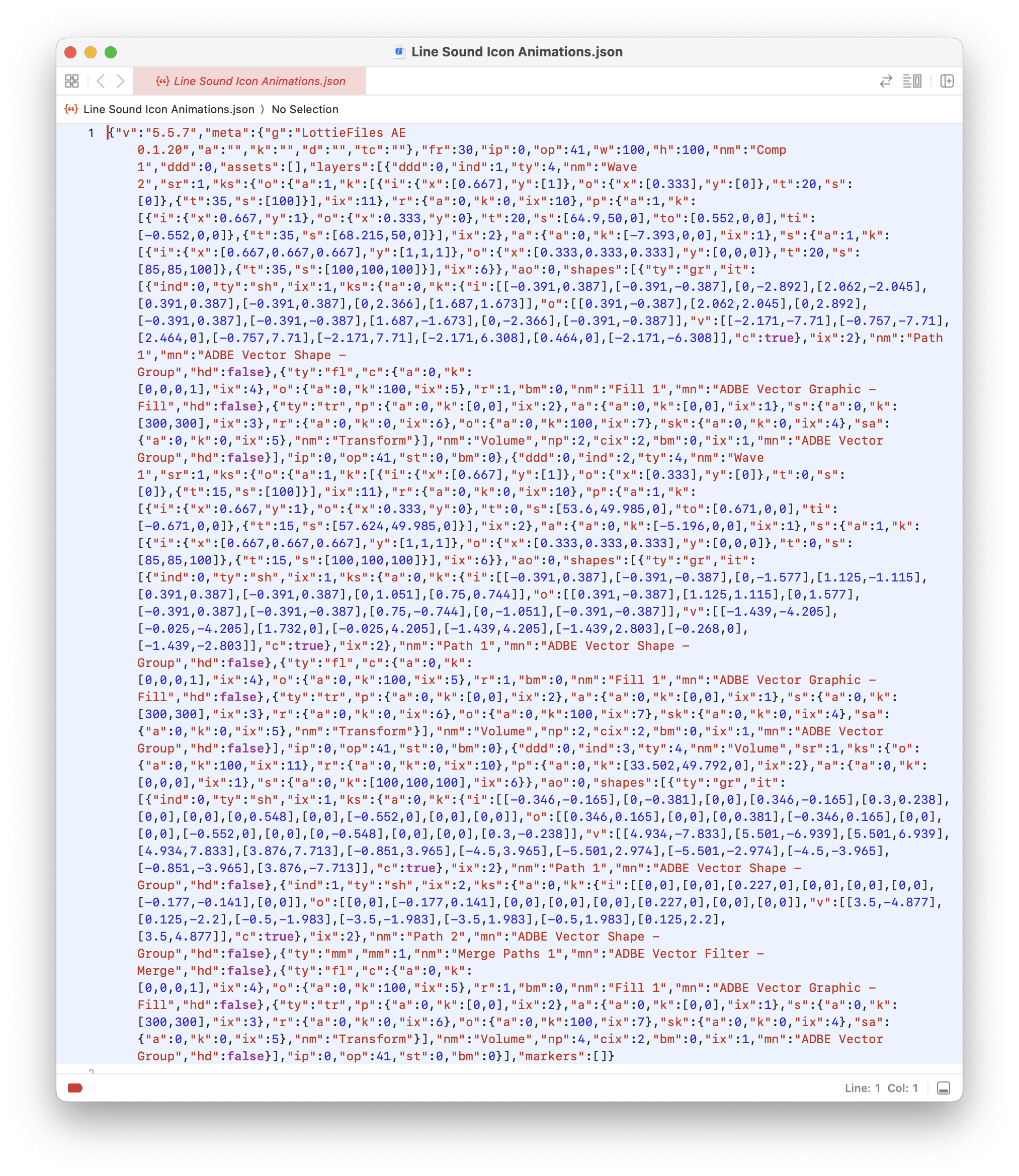 2. Open the Line Sound Icon Animations.json document in a text editor (I’m using Xcode but you can use any plain text editor) (figure #3)