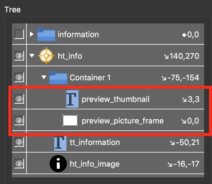 3.10 In the 'Tree', click and drag the 'preview_thumbnail' and 'preview_picture_frame' elements into the 'ht_info' hotspot (Figure #22)