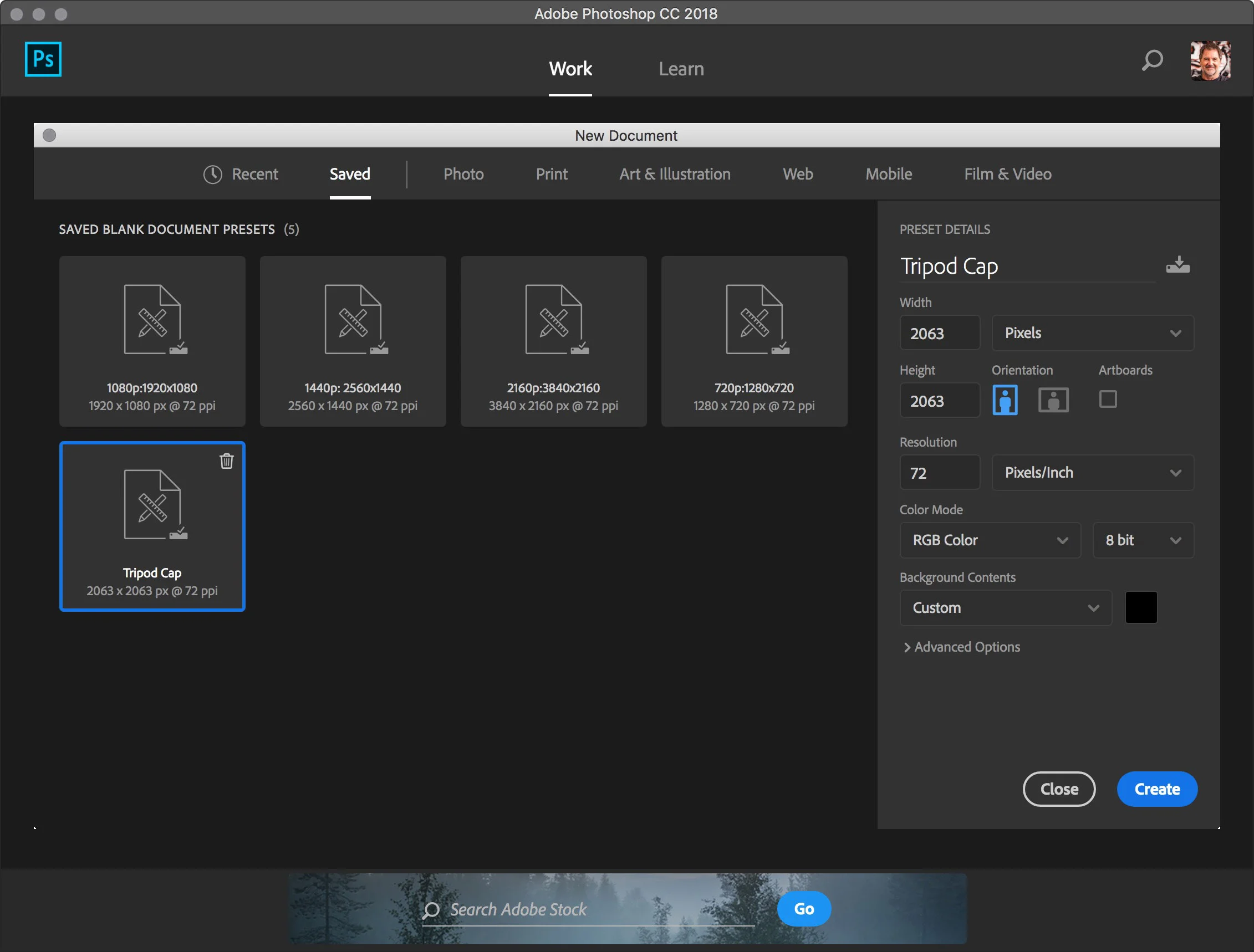 I've saved a preset called "Tripod Cap" and I've selected it for my document