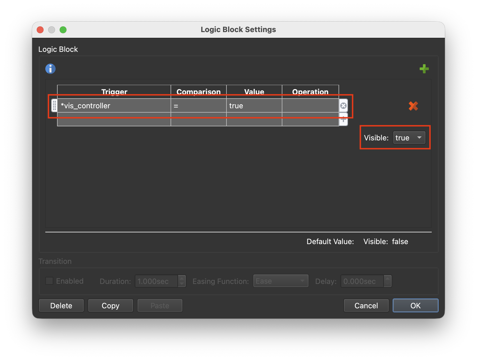 Appearance: Visible: logic block: Trigger = *vis_controller | Comparison = | Value = True | Visible = true (figure #21)
