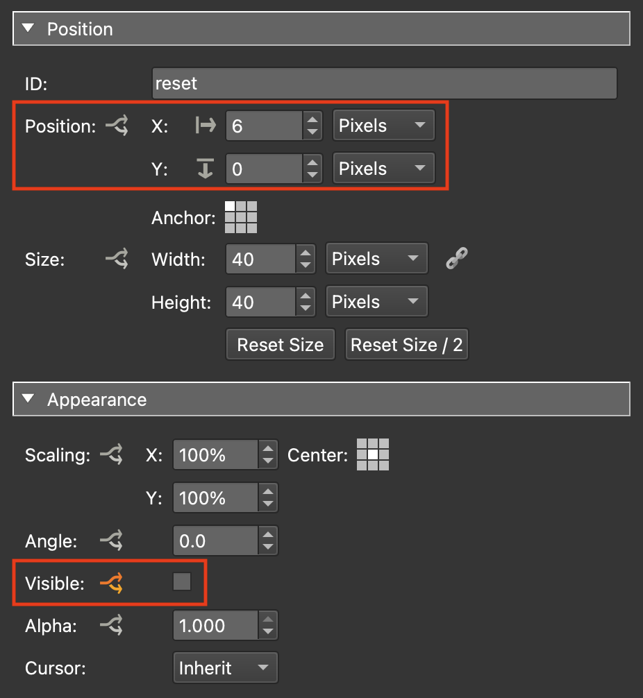 9. Set the Properties: Position: Size: 40:40 px