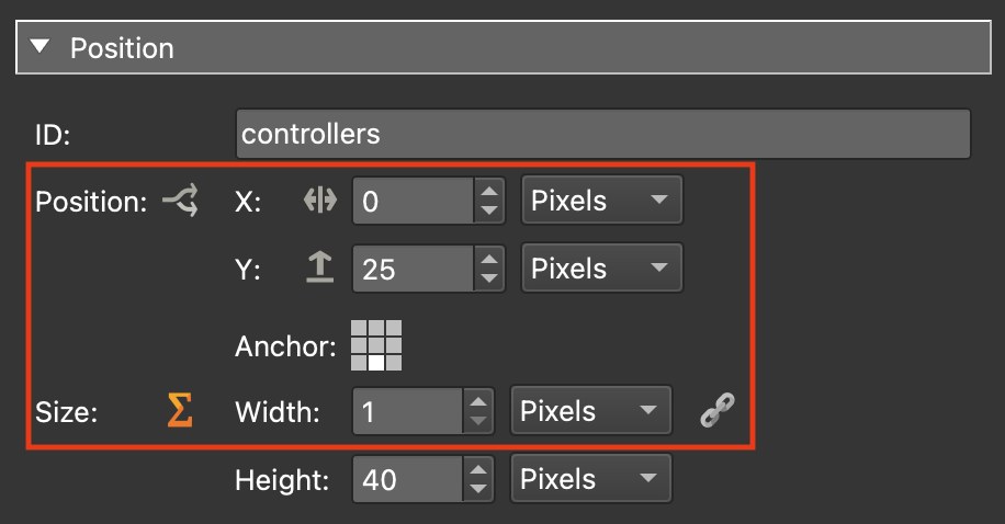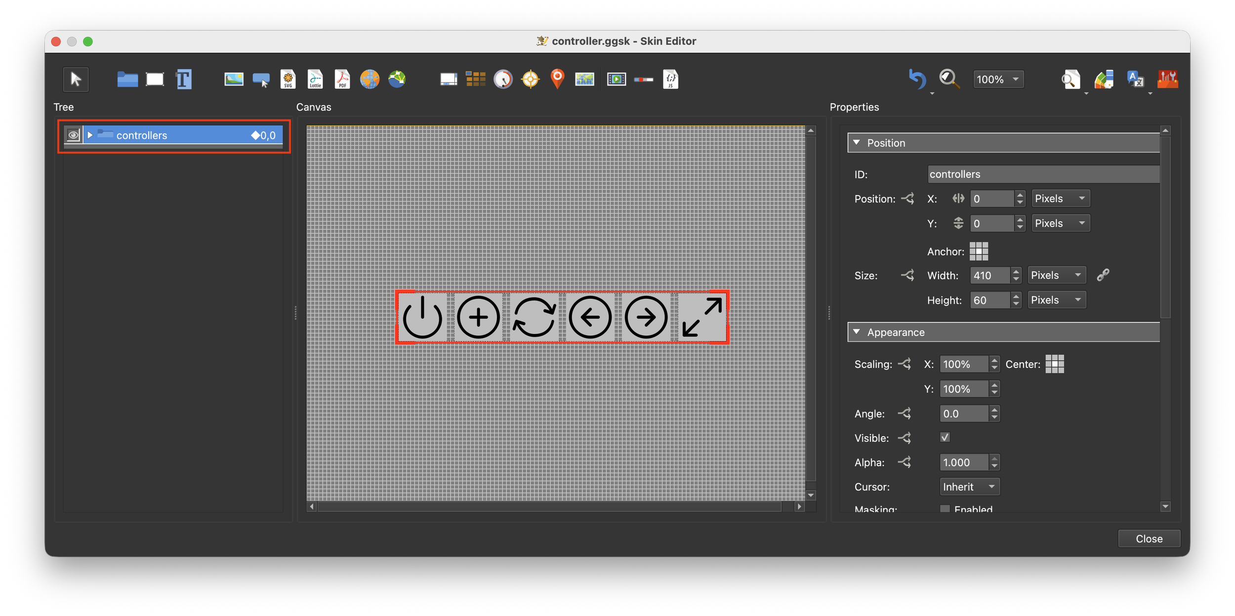 Note: when we place the controllers container into the menu_bar element we will want it to maintain a center position in the bar. To do so we must resize the container to match the elements.