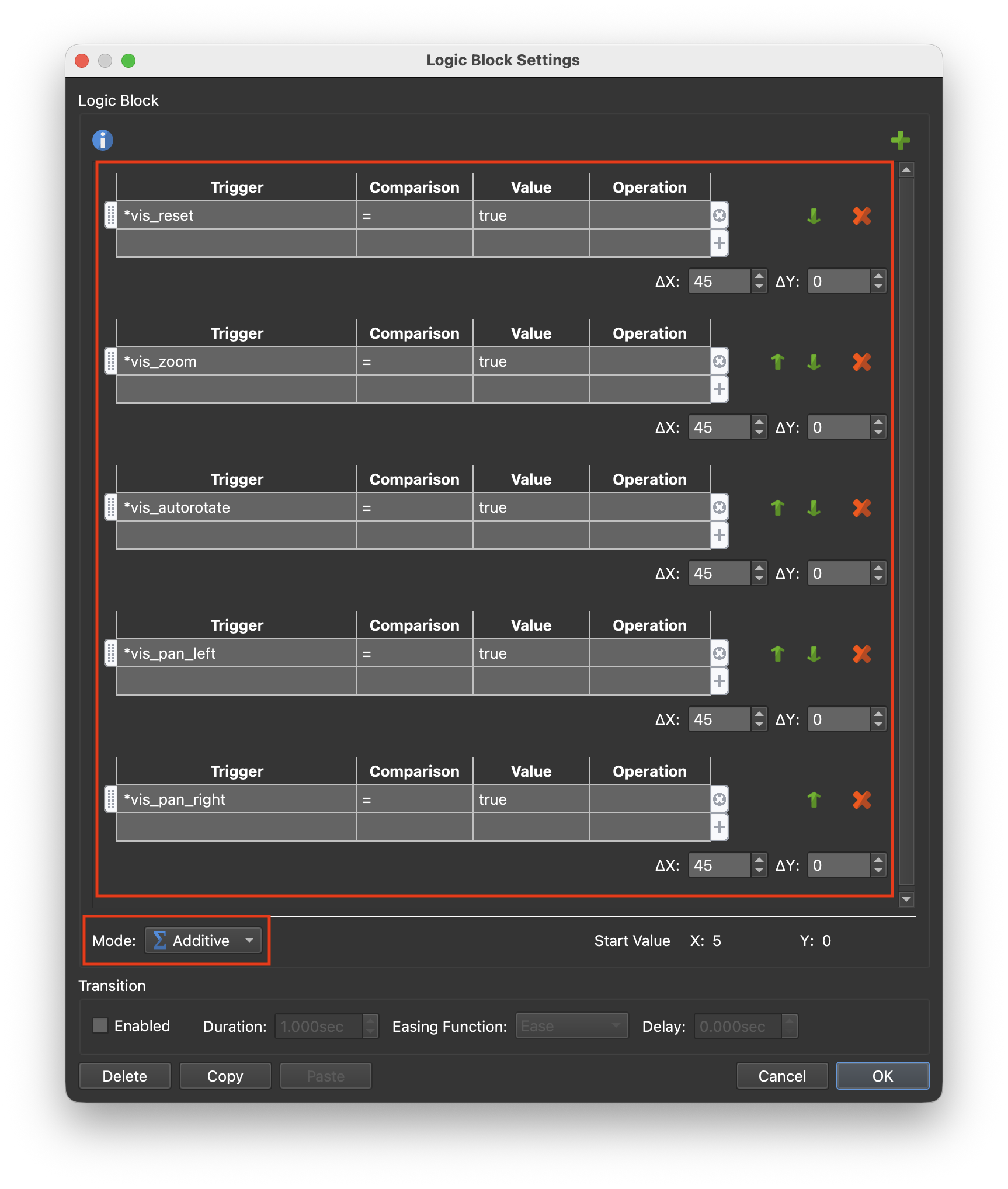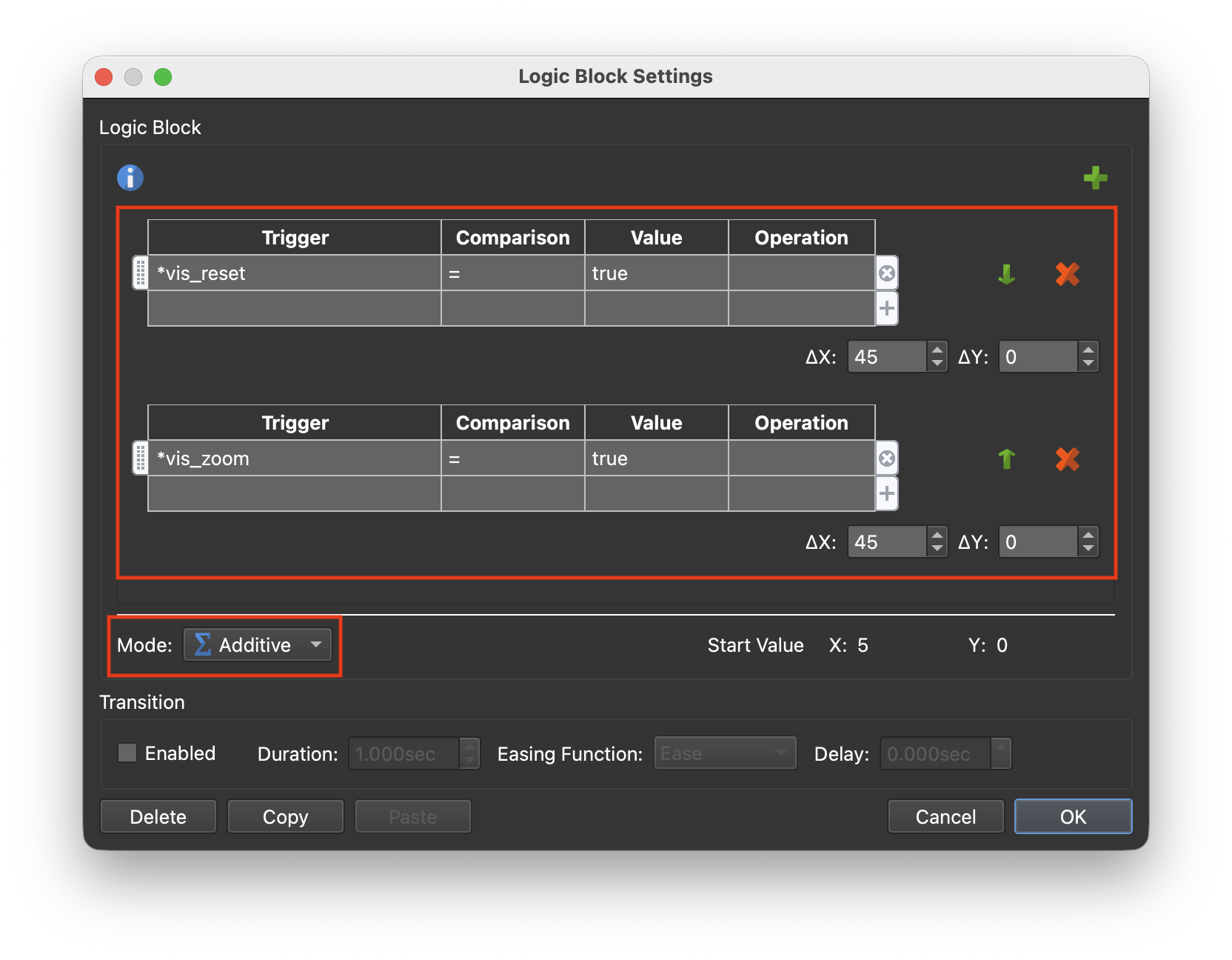 Mode: Additive (set this first)Trigger = *vis_reset | Comparison = | Value = True | Visible = true