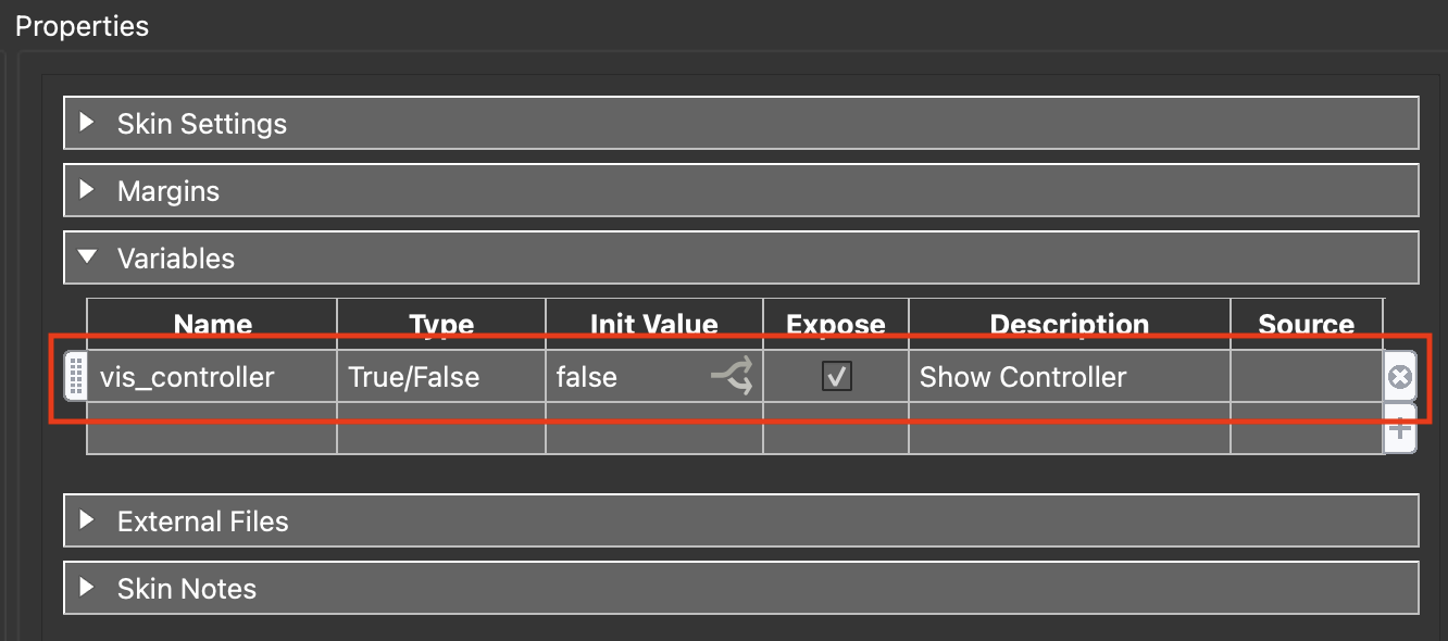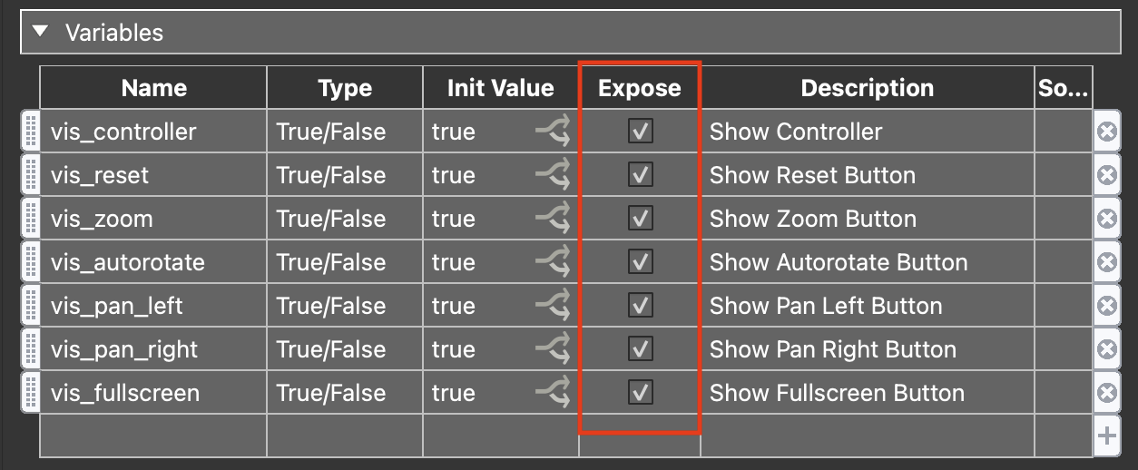 Name: vis_controller | Type: True/False | Init Value: true | Expose: checked | Description: Show Controller (figure #9)