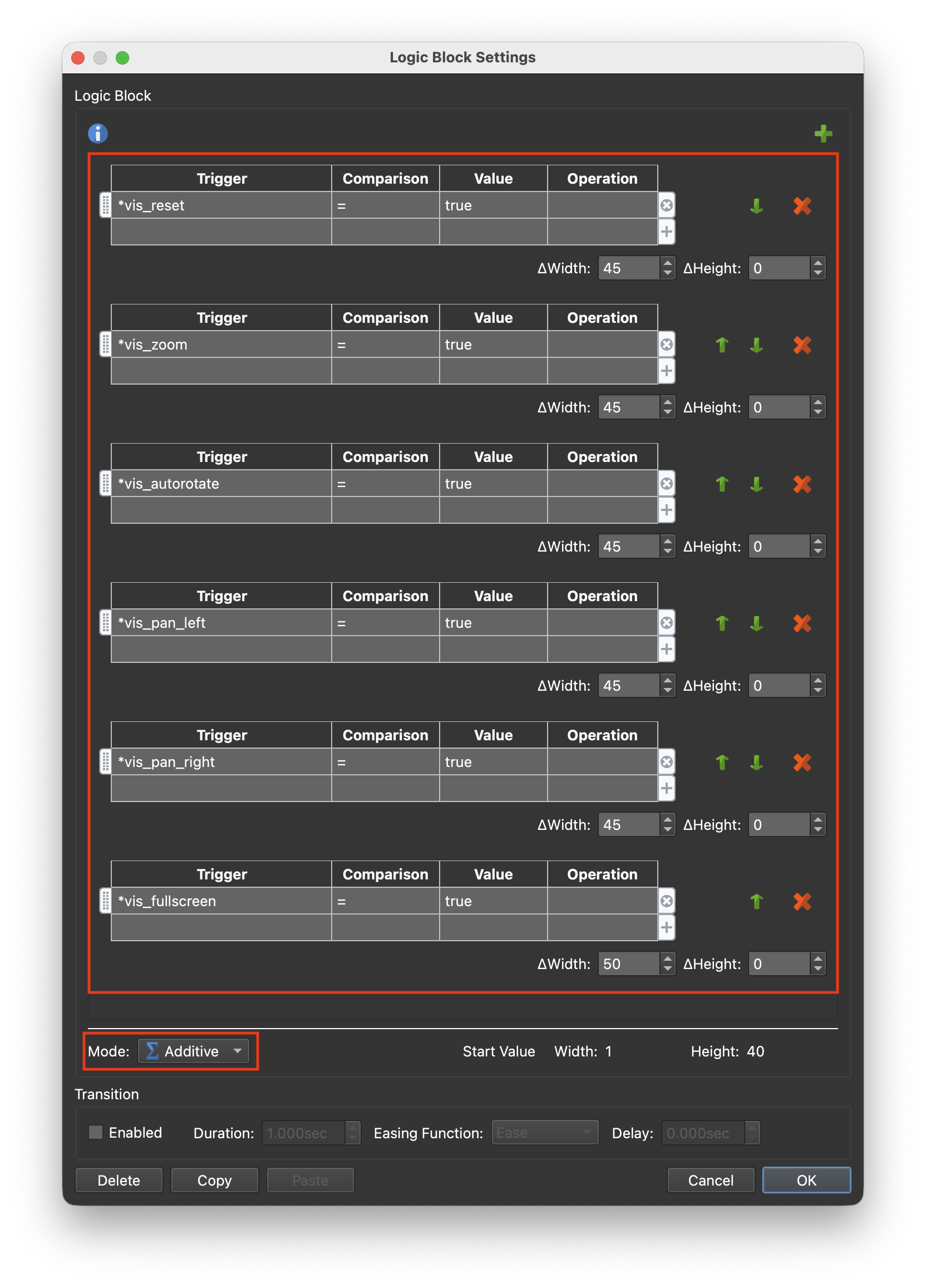 Note: a good trick here is to copy the Fullscreen element additive logic block. Paste it into the containers logic block, add in the width amounts and add the vis_fullsreen trigger at the end making sure to have the vis_fullsreen width 50.