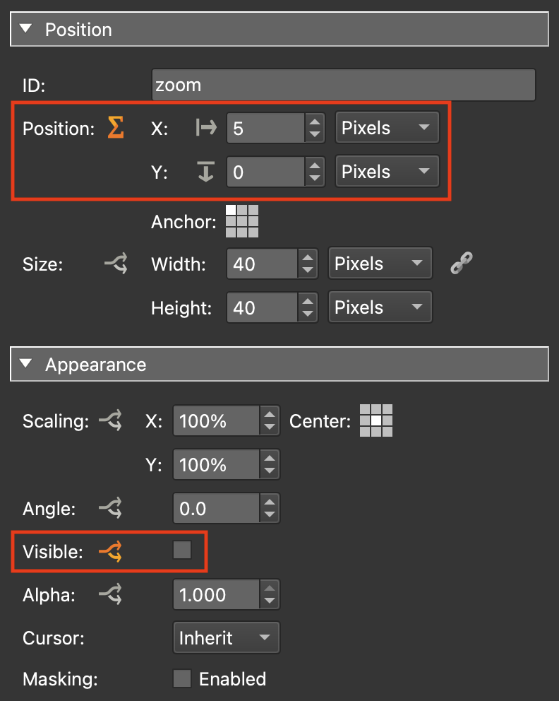 Note: This may look a little counter intuative using referencing the reset element in the zoom element properties but what it’s defining is the fact that if the reset element is visible then set me (the zoom container) to a position 45 pixels to the right. If the reset element is not visible then set me to the default position 5 pixels to the right