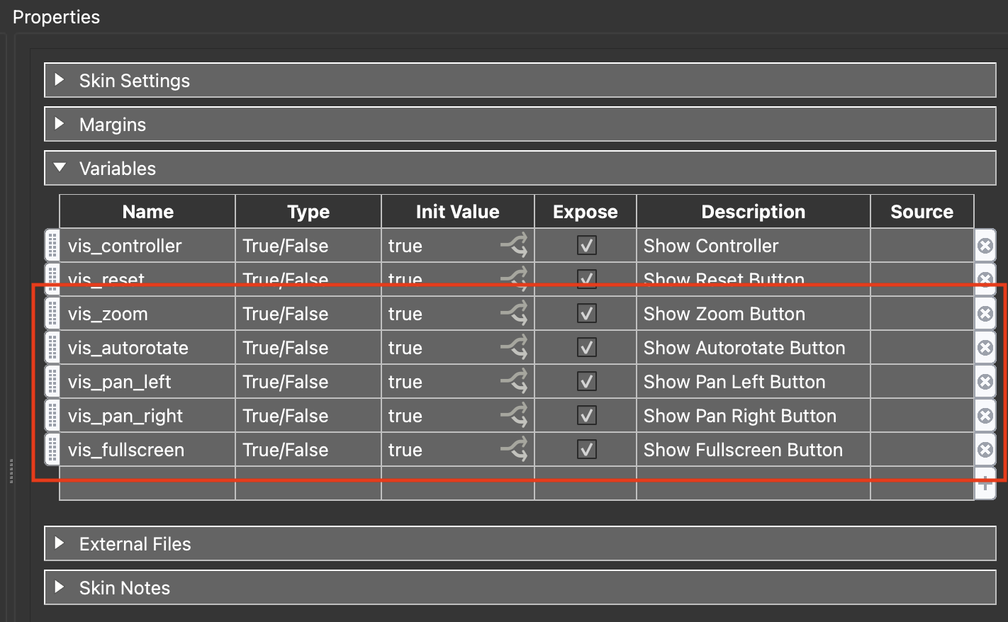 Note: in Step 3: Adding Variables section 14 we added a number of variables and exposed each of them. By exposing them it allows us to define a set of buttons for individual tours without having to use the Edit Skin function (figure #23)