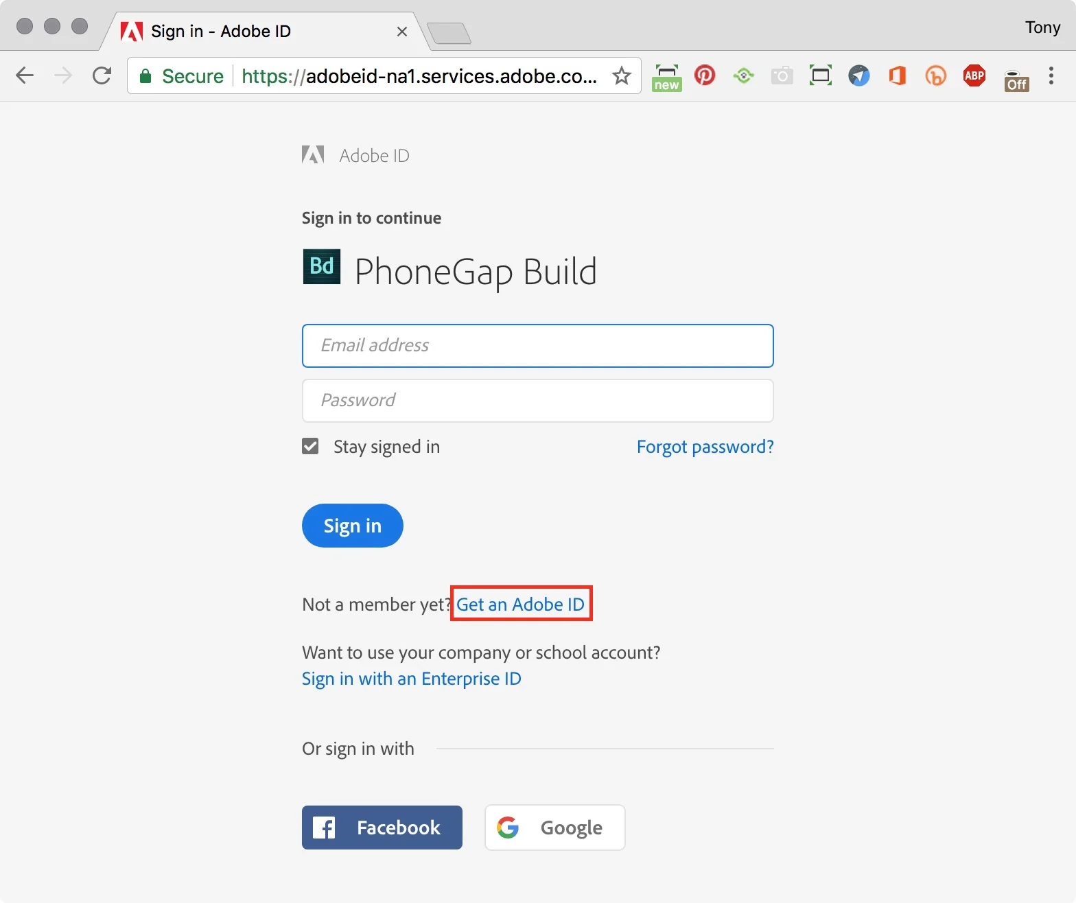 If you don't already have an Adobe ID you can set one up within the Adobe PhoneGap Build application