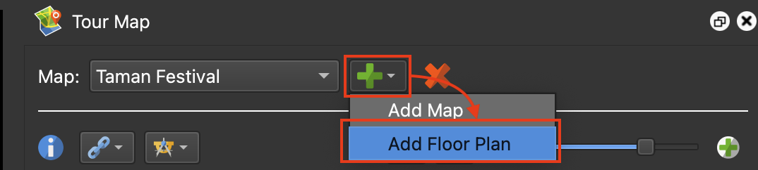 Click on Menu > Tour Map to open the Properties - Map panel, click the “+” button and select Add Floorplan.