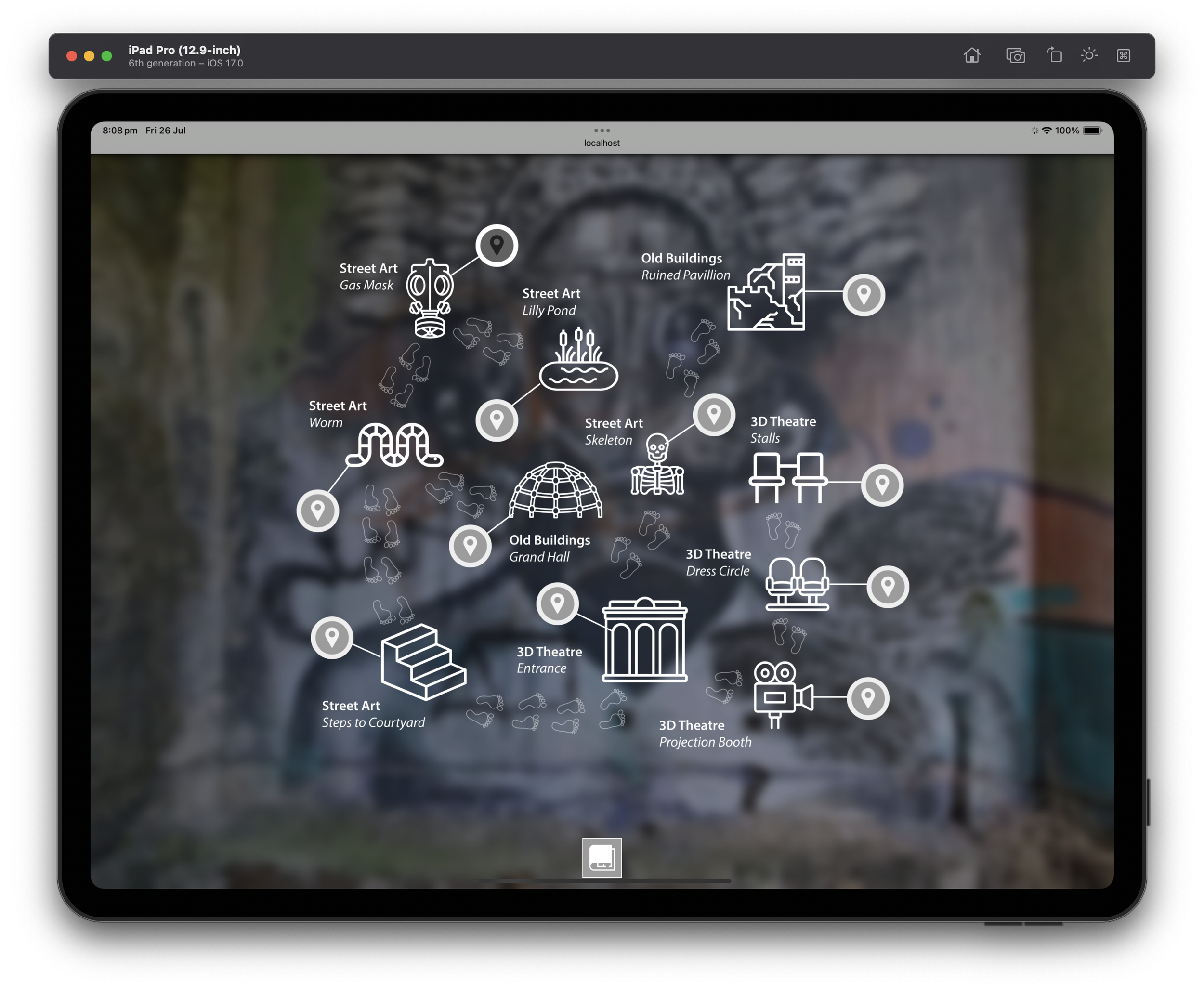 The SVG Map is a completely different navigation concept that uses a full-screen diagrammatic map to represent the locations within the tour.